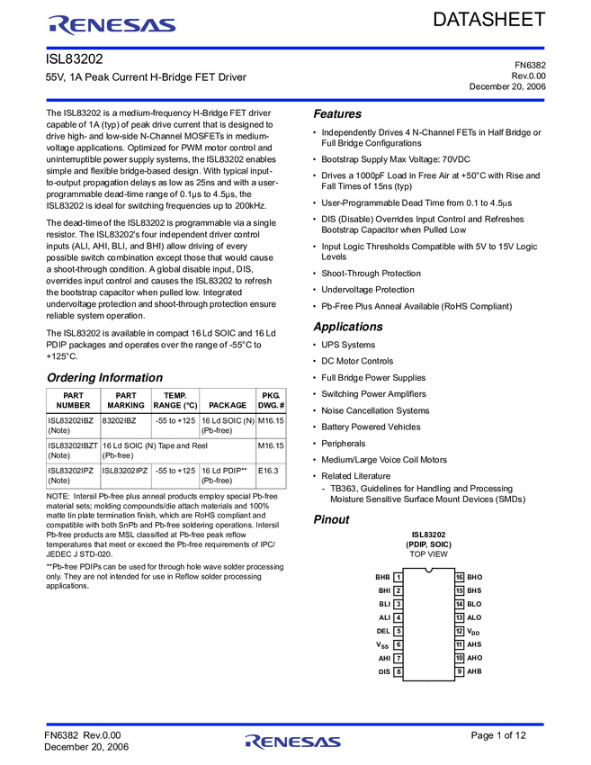 ISL83202IBZ 55V, 1A Peak Current H-Bridge FET Driver