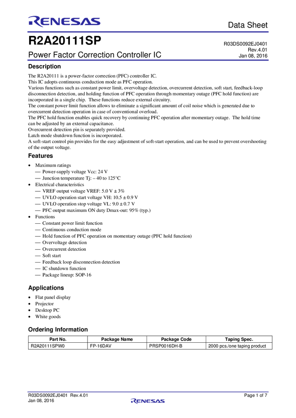 R2A20111SP Power Factor Correction Controller IC