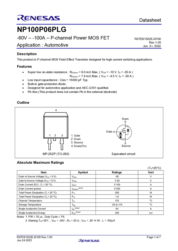 NP100P06PLG-E2-AY Pch Power MOSFET -60V -100A 6mohm TO-263 / D2PAK for Automotive
