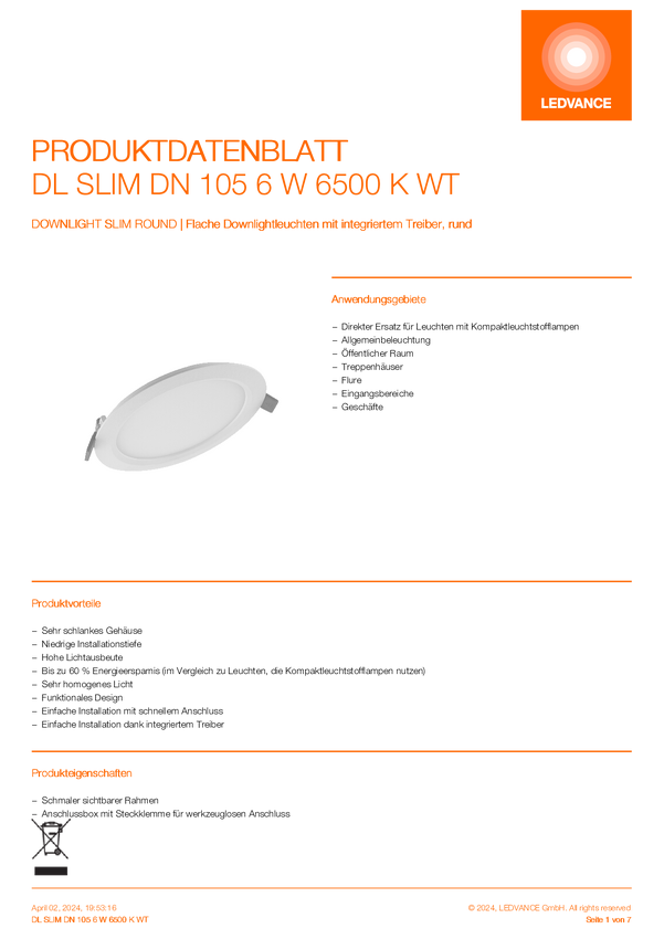 Lampa do zabudowy LEDVANCE DL SLIM DN105 6W-6500K WT IP20 LEDV 4058075079014 6 W