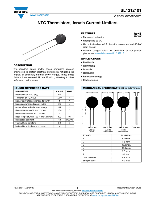 SL1212101 NTC Thermistors, Inrush Current Limiters