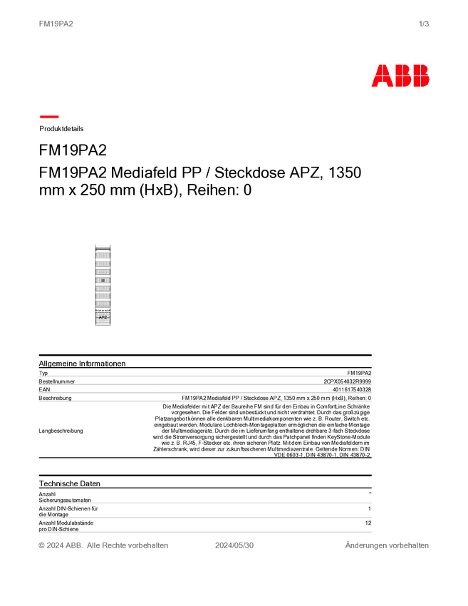 Rozdzielacz multimedialny Striebel & John FM19PA2 2CPX054032R9999, 250 mm x 1350 mm x 160 mm, 1 szt.