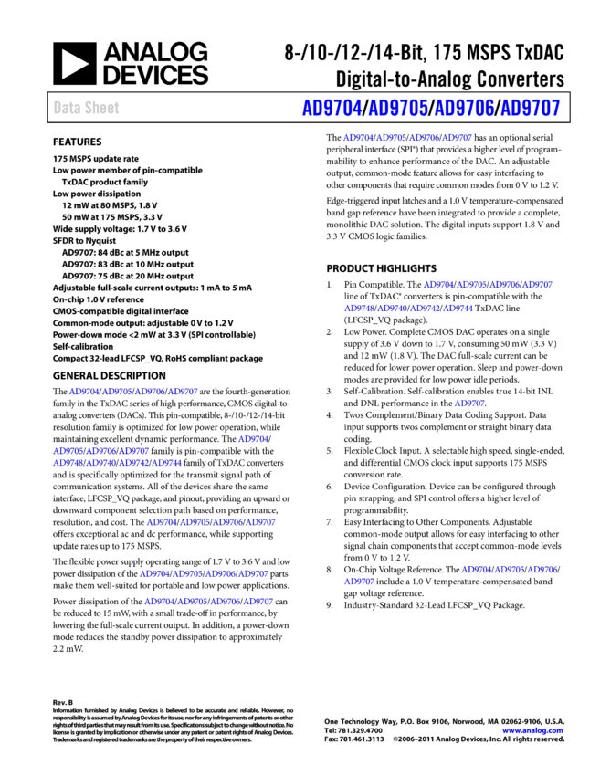 AD9707: 14-Bit, 175 MSPS TxDAC® Digital-to-Analog Converter