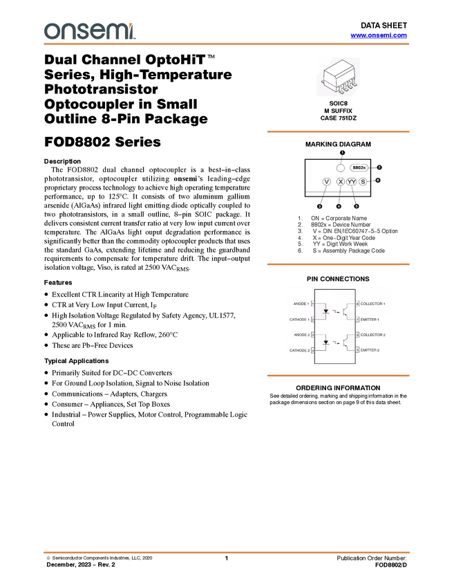 FOD8802A Dual Channel OptoHiT™ Series, High-Temperature Phototransistor Optocoupler...