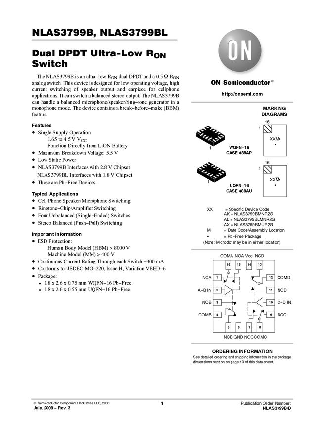NLAS3799B Analog Switch, Dual DPDT, Ultra-Low RON