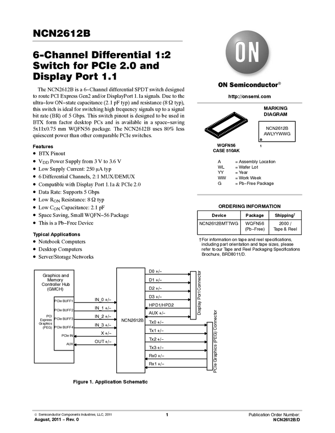 NCN2612B Data Switch, 6-Differential Channel 1:2 Switch for PCIe 2.0 and Display Por...