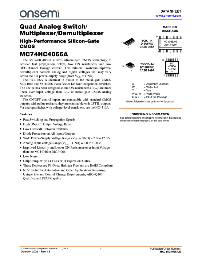 MC74HC4066A Quad Analog Switch/Multiplexer/Demultiplexer (Mux/Demux)