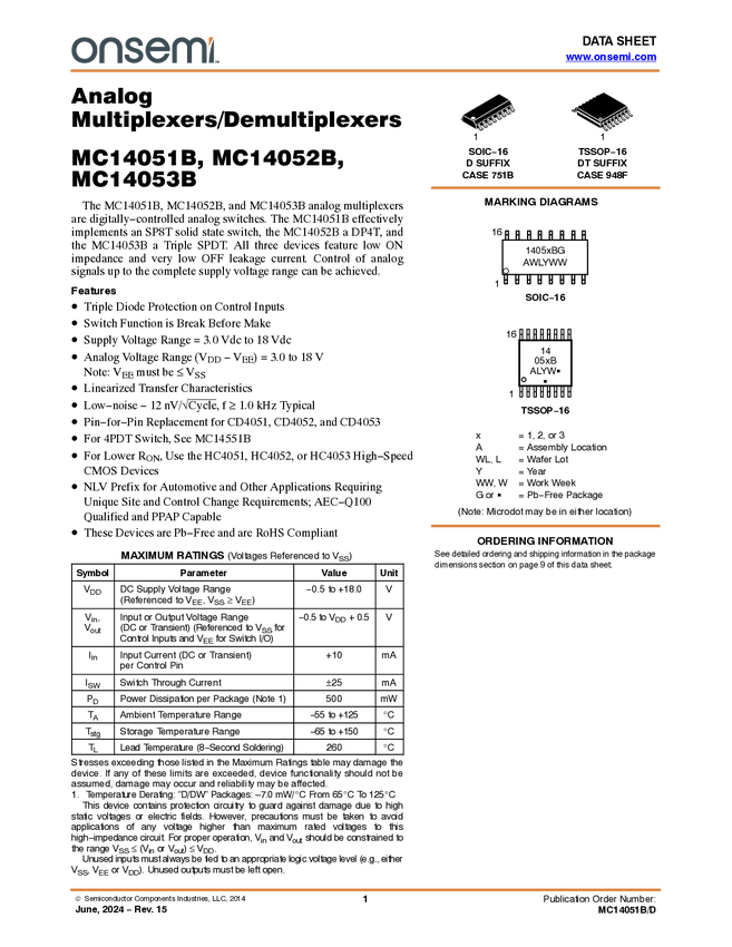 MC14052B Triple 2-Channel Analog Multiplexer/Demultiplexer (Mux/Demux)