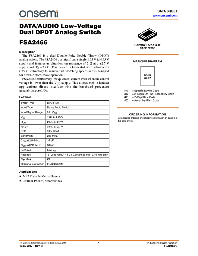 FSA2466 DATA / AUDIO Low-Voltage Dual DPDT Analog Switch