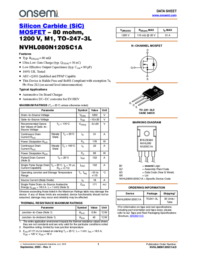 NVHL080N120SC1A Silicon Carbide (SiC) MOSFET, N‐Channel - EliteSiC, 80mohm, 1200 V, M1, TO2...