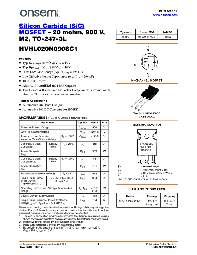 NVHL020N090SC1 Silicon Carbide (SiC) MOSFET, N‐Channel- EliteSiC, 20 mohm, 900 V, M2, TO24...