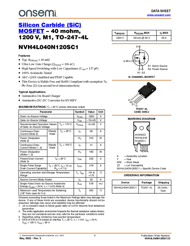 NVH4L040N120SC1 Silicon Carbide (SiC) MOSFET, N‐Channel - EliteSiC, 40 mohm, 1200 V, M1, TO...