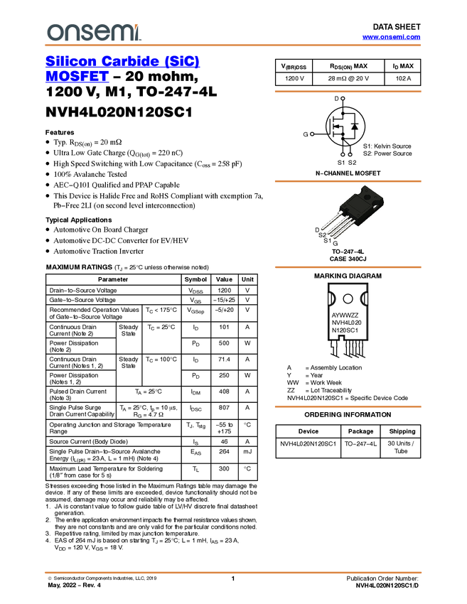 NVH4L020N120SC1 Silicon Carbide (SiC) MOSFET, N‐Channel - EliteSiC, 20 mohm, 1200 V, M1, TO...