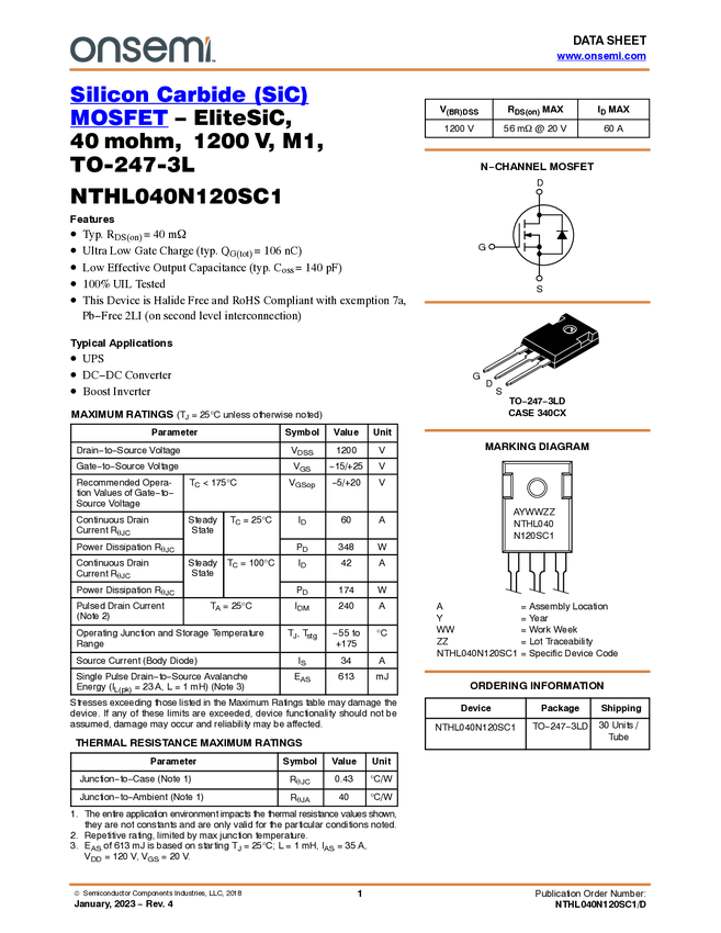 NTHL040N120SC1 Silicon Carbide (SiC) MOSFET - EliteSiC, 40 mohm, 1200 V, M1, TO-247-3L