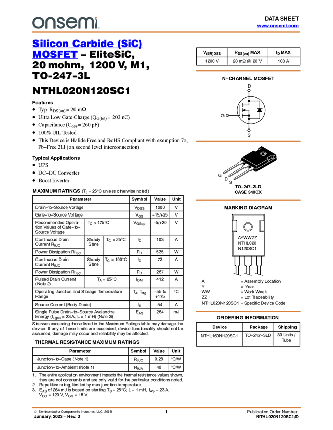 NTHL020N120SC1 Silicon Carbide (SiC) MOSFET - EliteSiC, 20 mohm, 1200 V, M1, TO-247-3L