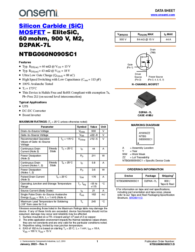 NTBG060N090SC1 Silicon Carbide (SiC) MOSFET - EliteSiC, 60 mohm, 900 V, M2, D2PAK-7L