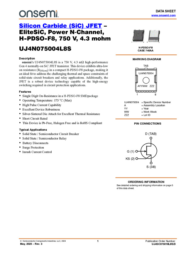 UJ4N075004L8S Silicon Carbide (SiC) JFET - EliteSiC, 4.3 mohm, 750V, TOLL