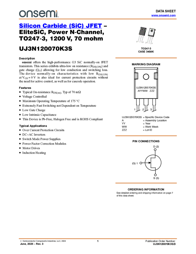 UJ3N120070K3S Silicon Carbide (SiC) JFET - EliteSiC, 70 mohm, 1200V, TO-247-3L