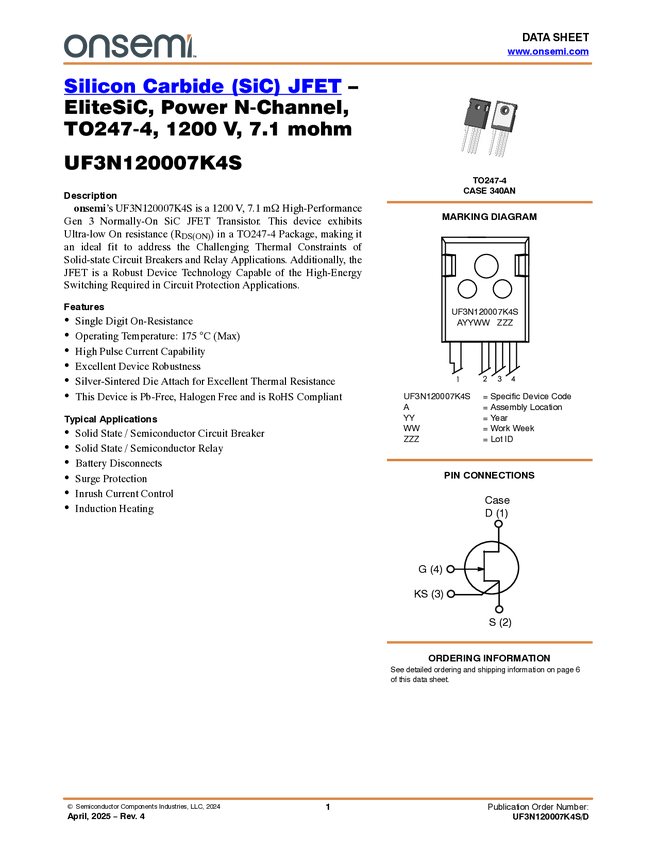 UF3N120007K4S Silicon Carbide (SiC) JFET - EliteSiC, 7.1 mohm, 1200V, TO-247-4L