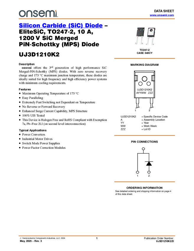 UJ3D1210K2 Silicon Carbide (SiC) Diode - EliteSiC, TO-247-2L, 10A, 1200V SiC Merged Pi...