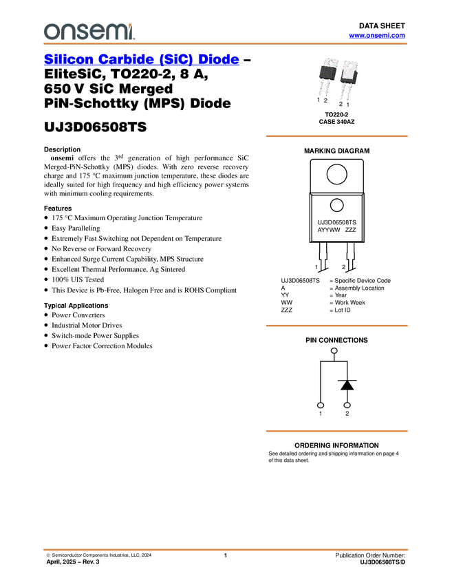 UJ3D06508TS Silicon Carbide (SiC) Diode - EliteSiC, TO-220-2L, 8A, 650V SiC Merged PiN-...