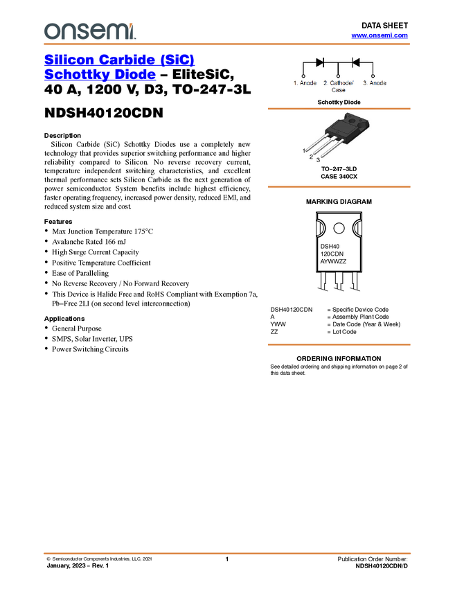 NDSH40120CDN Silicon Carbide (SiC) Schottky Diode – EliteSiC, 40 A, 1200 V, D3, TO-247-3...