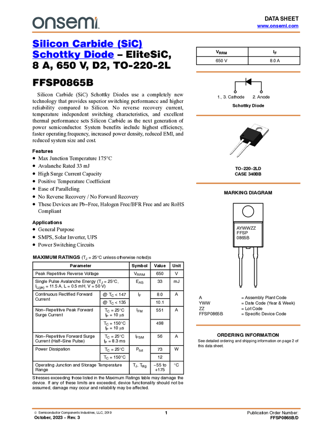 FFSP0865B Silicon Carbide (SiC) Schottky Diode – EliteSiC, 8 A, 650 V, D2, TO-220-2L