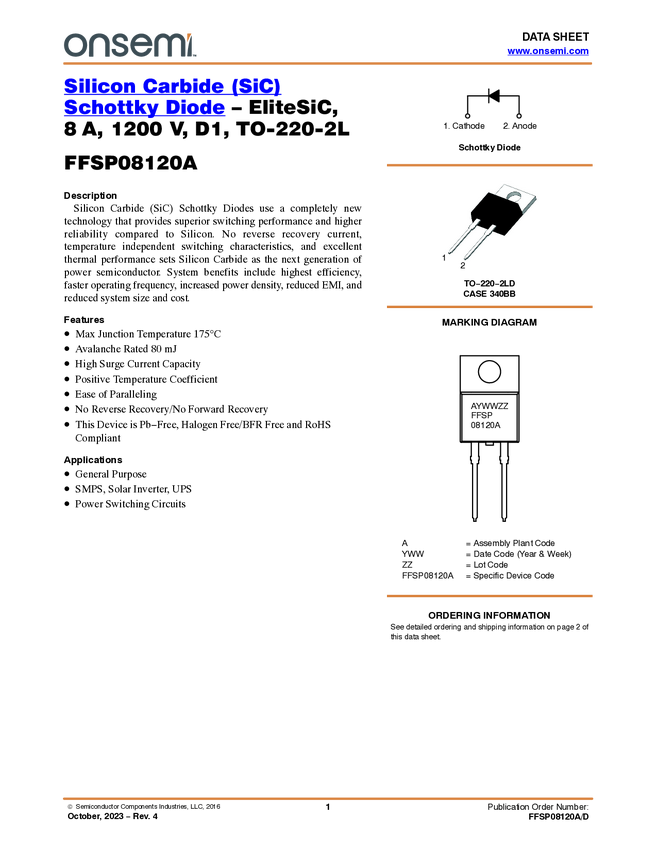 FFSP08120A Silicon Carbide (SiC) Schottky Diode – EliteSiC, 8 A, 1200 V, D1, TO-220-2L