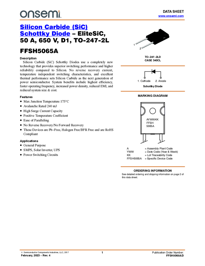 FFSH5065A Silicon Carbide (SiC) Schottky Diode – EliteSiC, 50 A, 650 V, D1, TO-247-2L