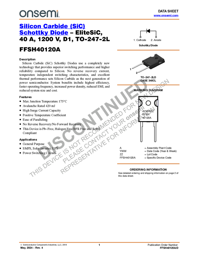 FFSH40120A Silicon Carbide (SiC) Schottky Diode – EliteSiC, 40 A, 1200 V, D1, TO-247-2...