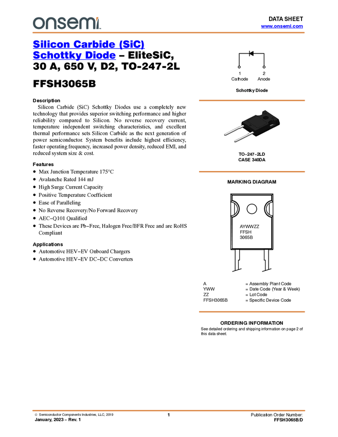 FFSH3065B Silicon Carbide (SiC) Schottky Diode – EliteSiC, 30 A, 650 V, D2, TO-247-2L