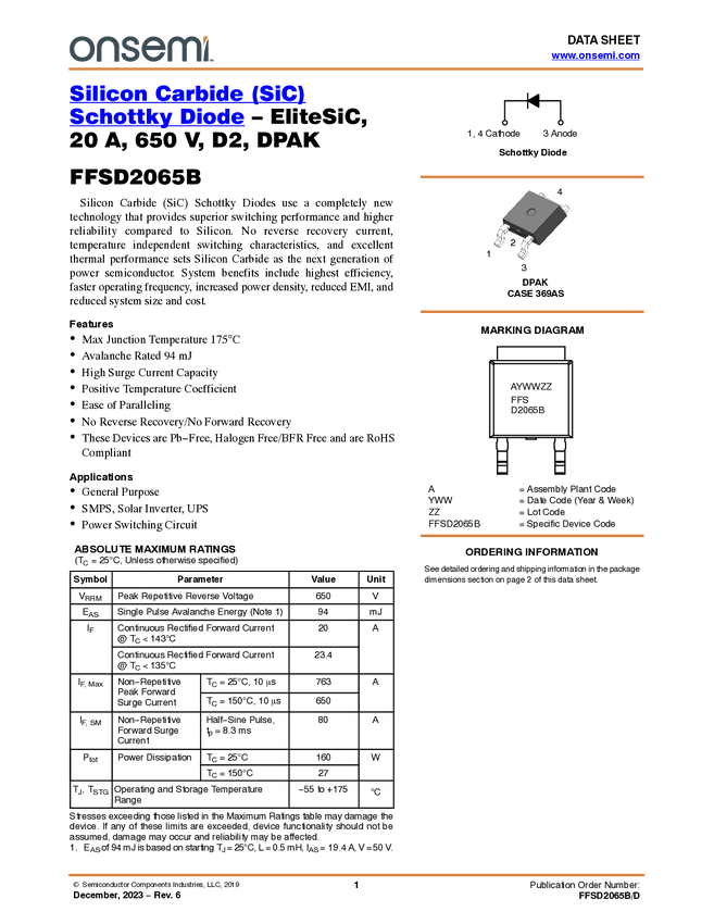 FFSD2065B Silicon Carbide (SiC) Schottky Diode – EliteSiC, 20 A, 650 V, D2, DPAK