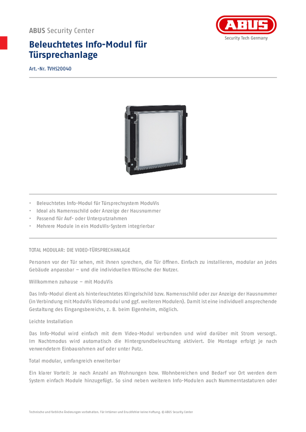 TVHS20040 Moduł informacyjny ABUS ABUS TVHS20040 Beleuchtetes Info-Modul TVHS20040, 1...