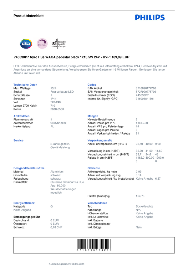 8718696174296 Lampa stojąca zewnętrzna LED Hue Nyro 8718696174296 13.5 W