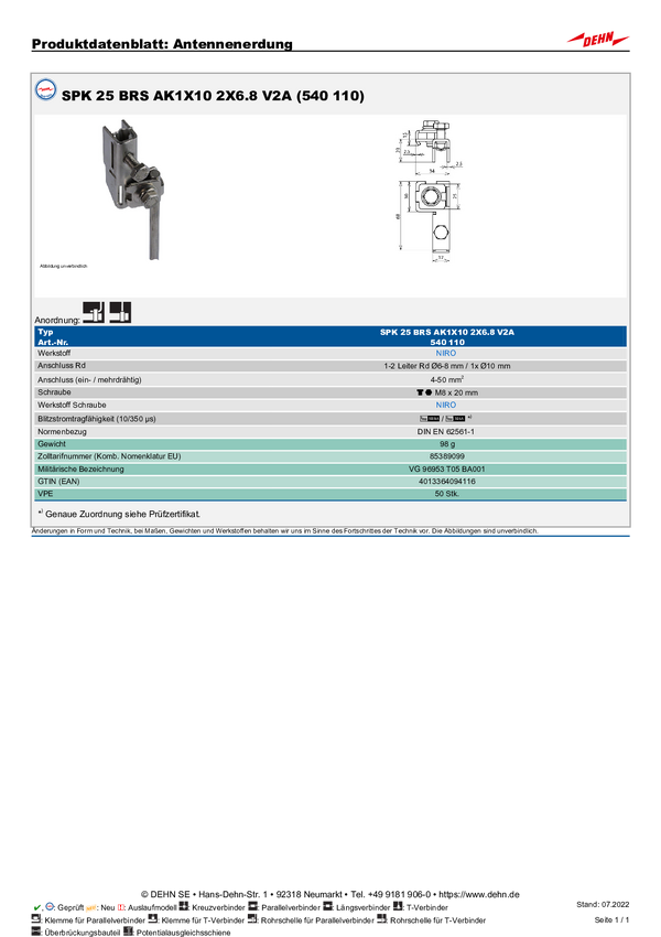 540110 DEHN 540110 SPK 25 BRS AK1X10 2X6.8 V2A Głowica mocująca 1 szt.