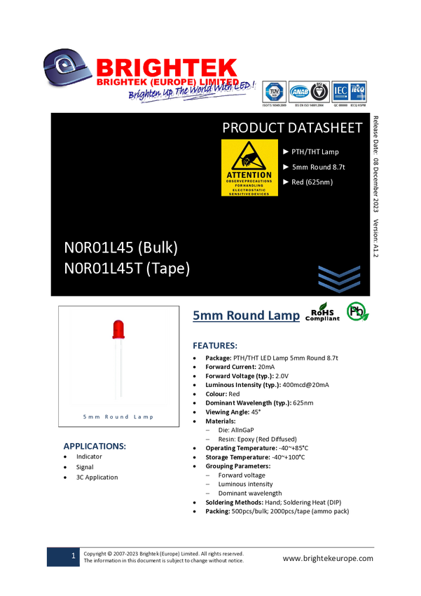 Dioda LED; 5mm; czerwony; 250-600mcd; 45*; 1,8-2,6VDC; 60mW; czerwona; THT; N0R01L45; BRIGHTEK; RoHS