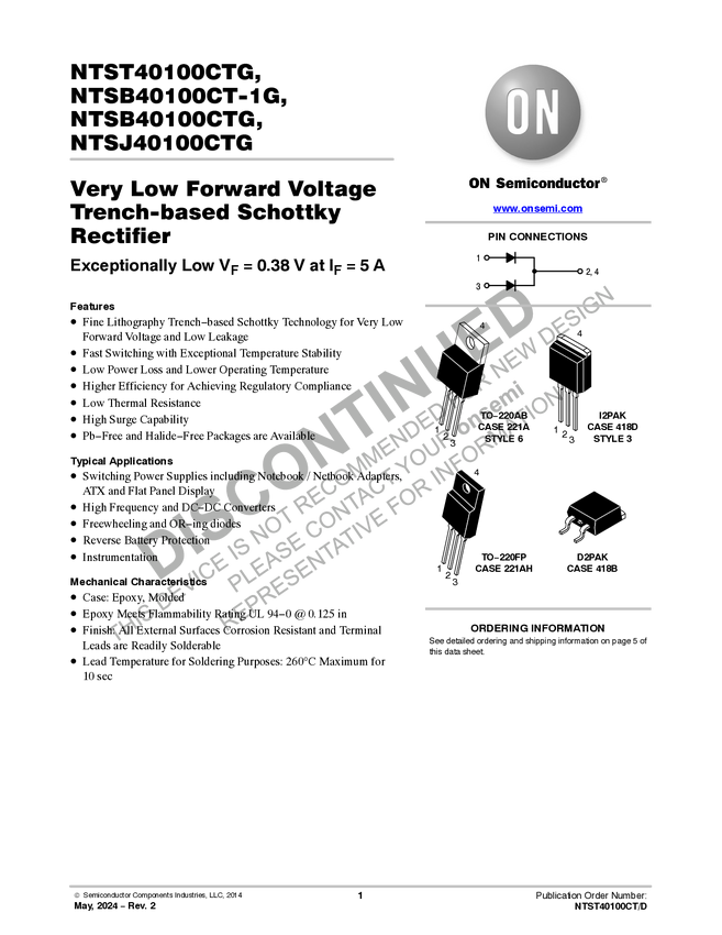 NTST40100CTG Schottky Power Rectifier, Dual, 40 A, 100 V