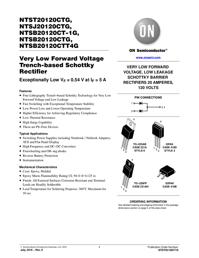 NTST20120CTG Schottky Rectifier, Low Forward Voltage, Dual, 20 A, 120 V