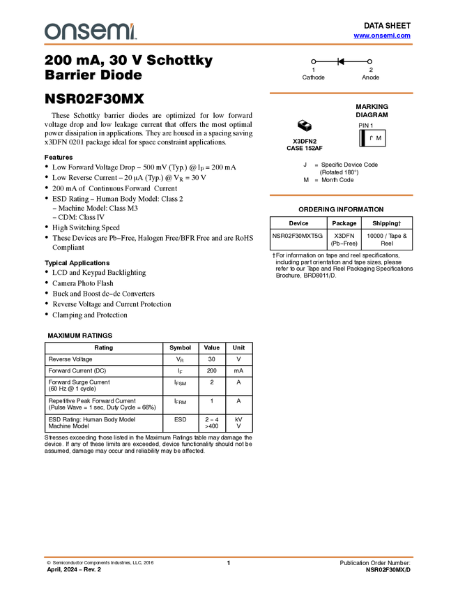 NSR02F30MX 200 mA, 30 V, Schottky Barrier Diode in X3DFN (0201)