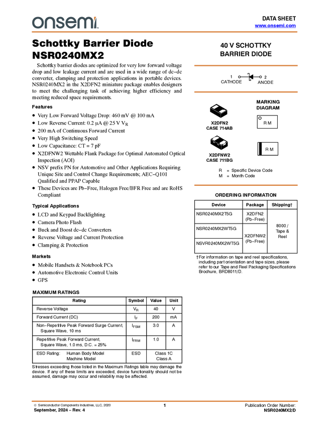 NSR0240MX2 40 V, 200mA Schottky Barrier Diodes in X2DFN2 & X2DFNW2