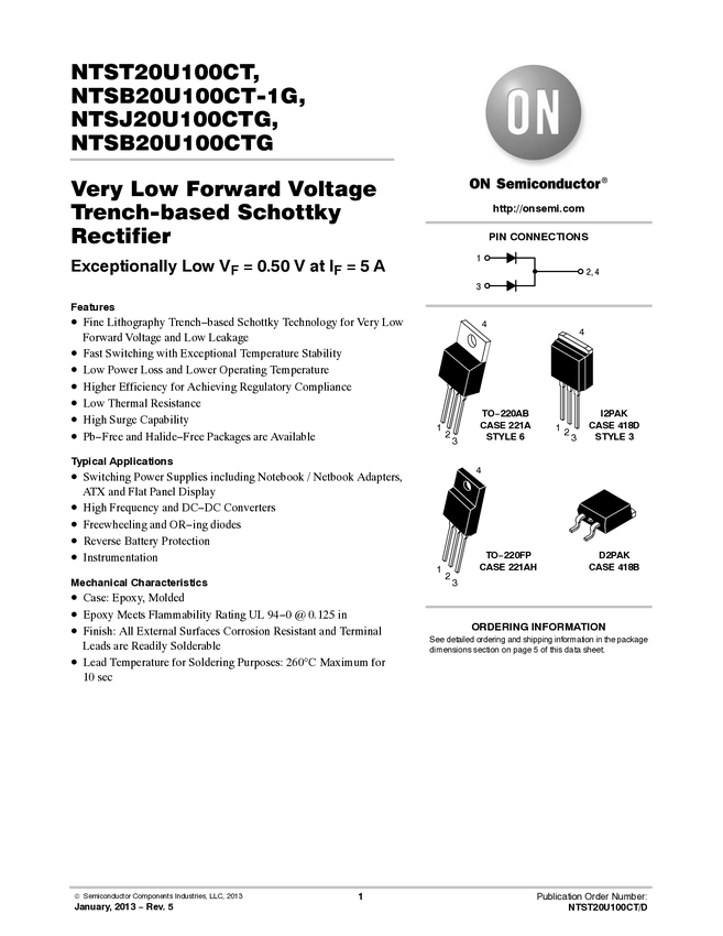 NTST20U100CTG Schottky Power Rectifier, Dual, 20 A, 100 V