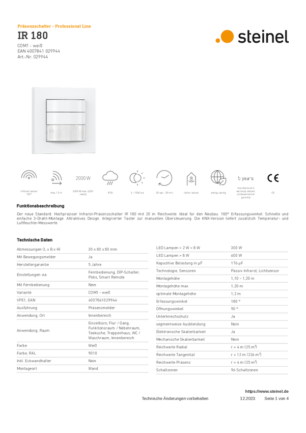 029944 Czujnik ruchu PIR Steinel 029944 180 ° IP20 biały