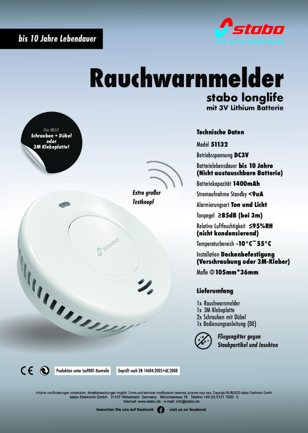 51132 Stabo Czujnik dymu zaw. baterię na 10 lat pracy bateryjne (Ø x W) 105 mm x...