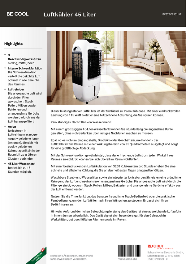 BC37AC2301IKF Be Cool Schładzacz powietrza 150 W (D x S x W) 49 x 39 x 108 cm biały pilot...