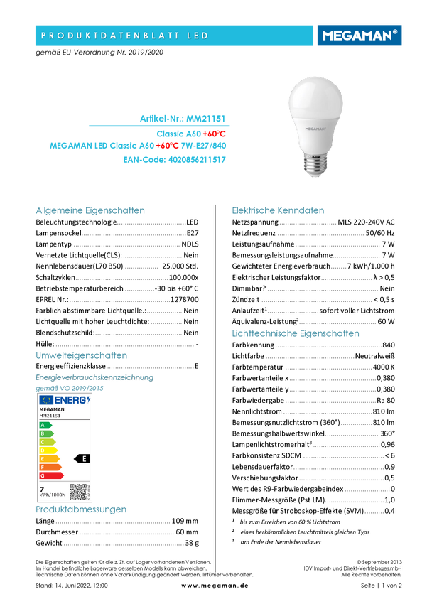 Żarówka LED Megaman MM21151 E-27 7 W = 60 W 810 lm biały 1 szt.