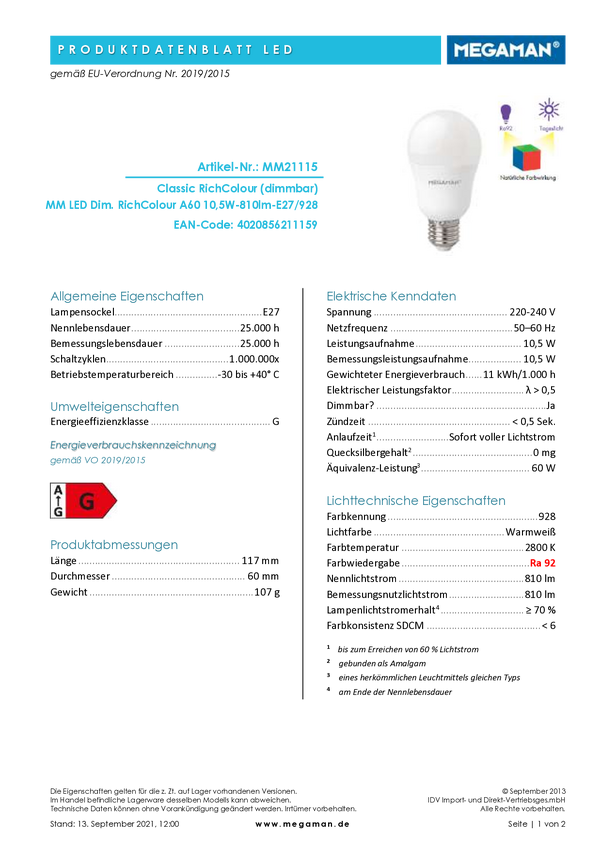 MM21115 Żarówka LED Megaman MM21115 E-27 10.5 W = 60 W 810 lm ciepła biel 1 szt.