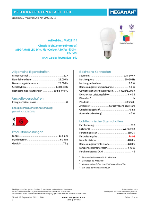 MM21114 Żarówka LED Megaman MM21114 E-27 7 W = 40 W 470 lm ciepła biel 1 szt.