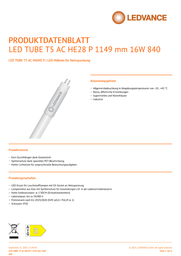 143670.LE.00.01 tuba LED LEDVANCE 143670.LE.00.01 G5 16 W = 28 W zimna biel 2400 lm