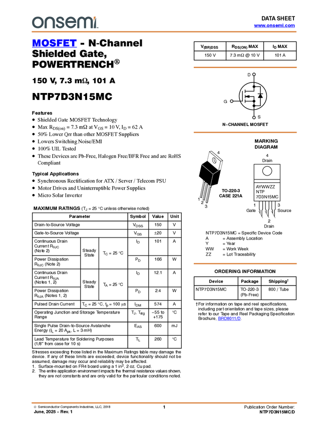 NTP7D3N15MC MOSFET - N-Channel Shielded Gate PowerTrench<sup>® 150 V, 7.3 mΩ, 101 A