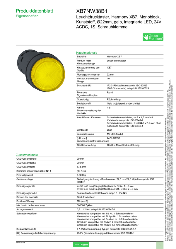 XB7NW38B1 Schneider Electric XB7NW38B1 Przycisk podświetlany 10 szt.